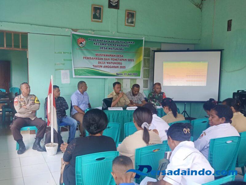 NTT-SIKKA Babinsa Koramil 1603-04/Kewapante jajaran Kodim 1603/Sikka Serma La Ngkawea menghadiri undangan kegiatan Musyawarah Desa Pembahasan dan Penetapan SDGS (Sustainable Development Goals) tahun 2025 di Aula Kantor Desa Watukobu, Kecamatan Kangae, Kabupaten Sikka, Senin(4/08/2025).
