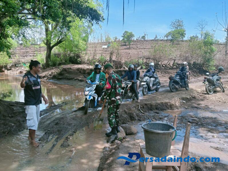 Bima – Soromandi – Akibat tingginya curah hujan dalam beberapa hari terakhir yang menyebabkan banyak jalan di wilayah Desa Binaan mengalami kerusakan, Serka Munir Babinsa Desa Punti Koramil 05/Donggo berinisiatif mengajak warga untuk bergotong royong menimbun jalan yang rusak akibat genangan air, pada Senin, (10/11/2025).