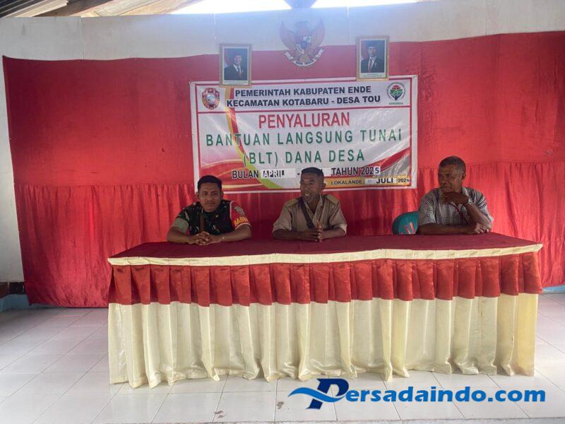 Ende, Babinsa Koramil 1602-04/Maurole, Pratu Muhamad Rifaldi, menghadiri kegiatan penyaluran Bantuan Langsung Tunai (BLT) Kemiskinan Ekstrim Dana Desa tahap I dan II di Desa Tou, Kecamatan Kotabaru, Kabupaten Ende. Kegiatan tersebut berlangsung pada Selasa pagi, pukul 10.10 Wita, dan berjalan lancar hingga selesai.