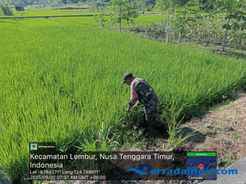 NTT — ALOR —, Babinsa Desa Tulleng, Desa Lembur Timur, dan Desa Luba Kecamatan Lembur, Sertu Isak Mauleti, melaksanakan kegiatan pembersihan gulma secara manual di lahan sawah milik Ibu Naomi Mimal pada Sabtu, 20 September 2025. Kegiatan tersebut berlangsung di Pakilai Barat pada area demplot pertanian warga binaan.