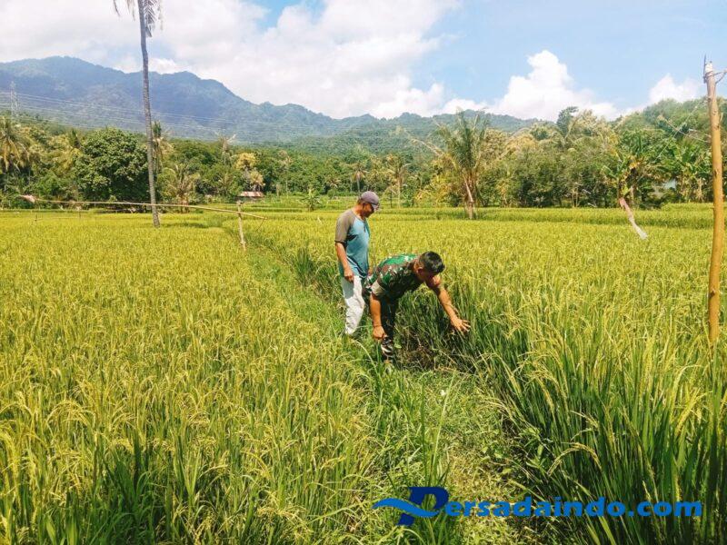 Serka Ketut Renten terjun langsung ke tengah hamparan padi milik salah seorang petani setempat, Bapak Wayan Widiana. Bapak Wayan, seorang petani berusia 55 tahun yang beralamat di Banjar Dinas Bukit Sari, memiliki lahan seluas 55 are yang ditanami padi jenis Ciherang. Kehadiran Babinsa di tengah aktivitas petani bukan hanya sekadar pemantauan, namun juga bentuk dukungan moril dan upaya untuk memahami secara langsung dinamika serta tantangan yang dihadapi petani di lapangan.