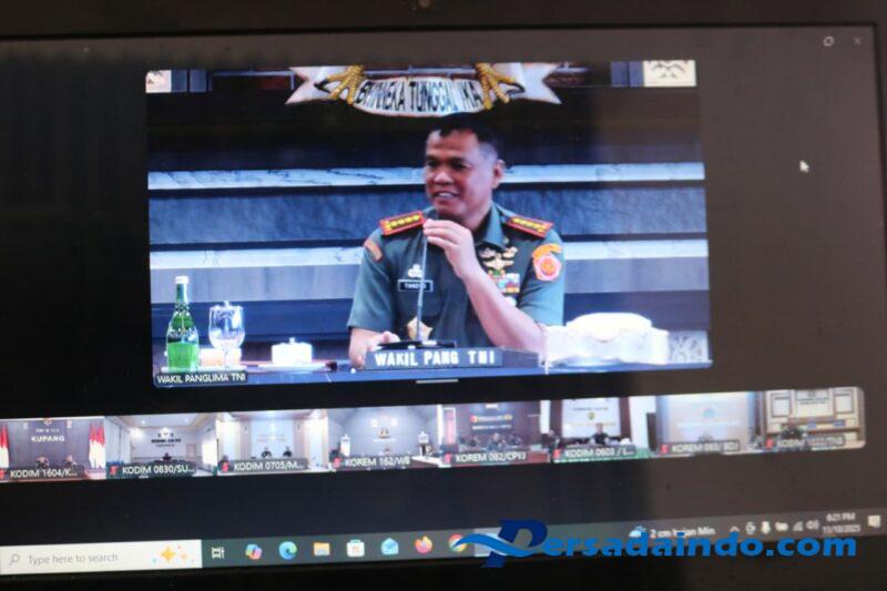 NTT-KUPANG, — Pgs. Kasdim 1604/Kupang Mayor Inf Hendry Dunant, S.I.P didampingi Pgs. Pasiterdim 1604/Kupang Kapten Inf Said Abdullah mengikuti rapat evaluasi percepatan pembangunan Koperasi Desa/Kelurahan Merah Putih (KDKMP) melalui video conference yang dipimpin langsung oleh Wakil Panglima TNI Jenderal Tandyo Budi. Kegiatan tersebut diikuti oleh seluruh Pangdam, Danrem, dan Dandim se-Indonesia sebagai bagian dari penguatan sinergi TNI dalam mendukung program strategis nasional di bidang pemberdayaan ekonomi masyarakat. Selasa (11/11/2025).