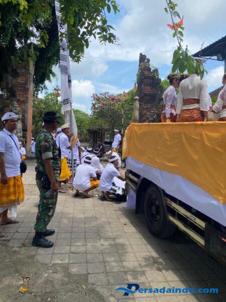 Gianyar – Tegallalang, Kamis (23/10/2025) Berikan pelayanan totalitas dalam mendukung kegiatan masyarakat di wilayah binaan, Babinsa Desa Keliki Koramil 1616-06/Tegallalang Sertu Dewa Made Sudiarta bersama Pecalang Desa Adat Keliki melaksanakan kegiatan pengamanan dan pengaturan arus lalu lintas dalam rangka kegiatan adat Mendak Pengerajek Karya di Pura Taman Pule, Desa Mas, Kecamatan Ubud.
