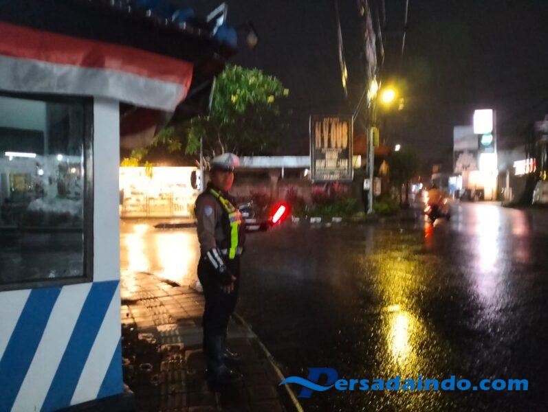 Tampak Personel Unit Lalu Lintas terus mengatur arus lalin di jalan raya Canggu tepatnya simpang Berawa Padonan meski dengan kondisi hujan. Minggu (6/7/2025) sore pukul 18.00 Wita