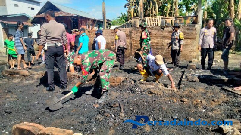 NTB – Sumbawa, Sebagai bentuk kepedulian dan solidaritas terhadap warga yang terdampak musibah kebakaran, Danramil 1607-04/Alas, Kapten Inf Triono Budi Waskito bersama anggota Koramil dan unsur Muspika Kecamatan Alas, bergotong royong membersihkan sisa puing-puing kebakaran di RT 01 RW 03 Dusun Dalam, Desa Dalam, Kecamatan Alas, Kabupaten Sumbawa, pada kamis (24/4/2025).