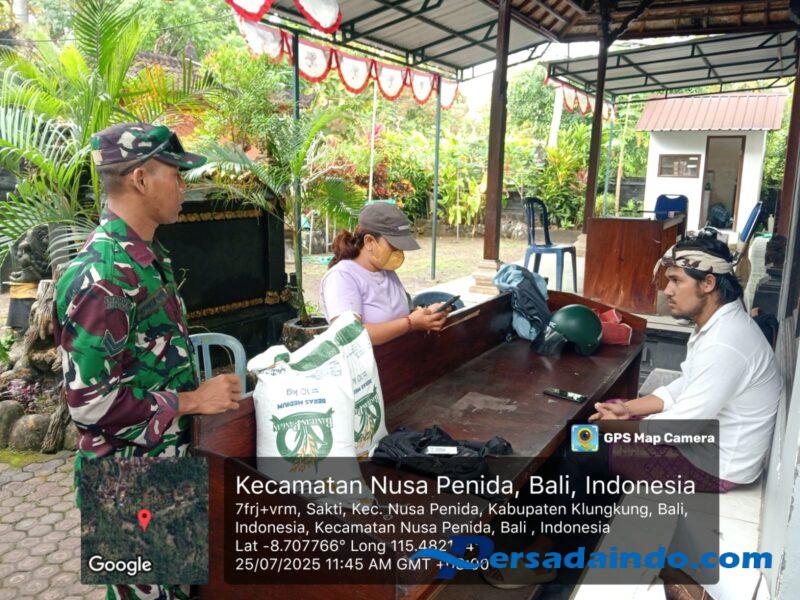 Klungkung, – Komitmen untuk memastikan Bantuan Pangan Beras diterima aman dan lengkap, Babinsa Sakti Koramil 1610-04/Nusa Penida kembali melaksanakan pengawasan dan pendampin Pendistribusian Bantuan Pangan (PBP) berupa beras kepada warga binaanya di Kantor Desa Sakti, Jumat ( 25/07/25 ).