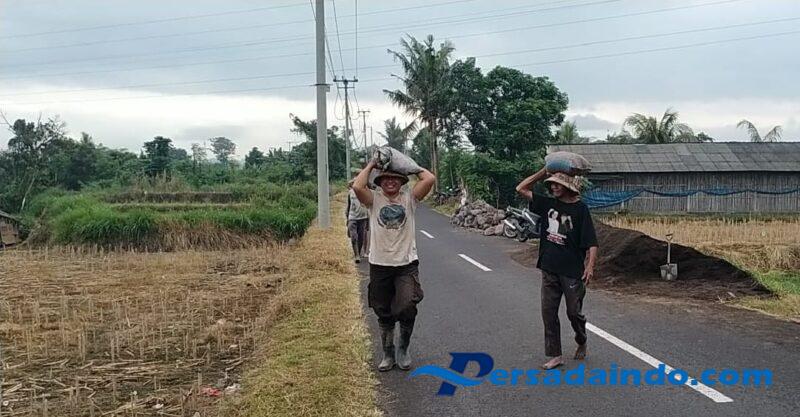 Menyusuri jalan persawahan, TNI dan petani tampak begitu kompak melangsir material dari jalan raya menuju ke lokasi perbaikan irigasi pertanian yang berlokasi di Tempek Bias Subak Delod Banjarangkan tersebut.