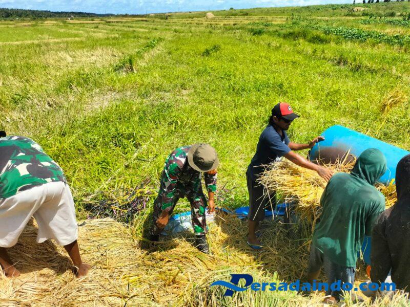 Persadaindo.com NTT Rote Ndao, Dalam rangka mendukung program ketahanan pangan, Babinsa Koramil 01/Ba’a Kodim 1627/Rote Ndao Koptu Alis Sinlae, melaksanakan pendampingan dan membantu petani memanen padi di persawahan Tanggadale Dusun Istua Desa Kuli Aisele Kecamatan Lobalain Kabupaten Rote Ndao,Sabtu (26/4/2025).