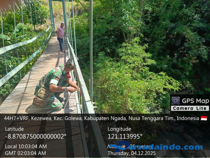 Ngada — Pada hari ini, Kamis 04 Desember 2025, Danpos Golewa Selatan Sertu Kristoforus R. Modo bersama Kopda Johansyah dan Pratu Aris Toda melaksanakan survey awal terkait rencana pembangunan Jembatan Gantung yang berlokasi di RT 05, RW 02, Dusun Niba, Desa Nirmala, Kecamatan Golewa Selatan, Kabupaten Ngada.