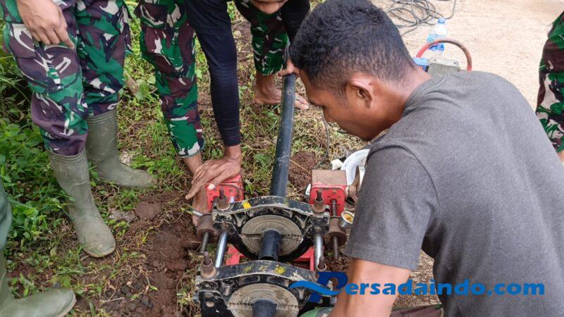 Dengan alat penyambung pipa HDPE seberat kurang lebih 5 kg di pundak, Pratu Dion dan rekan-rekannya harus memikul serta mendorong peralatan menyusuri jalan Desa. Tantangan bertambah karena setiap 100 meter harus dilakukan penyambungan pipa secara manual, sehingga mereka harus membawa peralatan tersebut sepanjang jalur proyek.