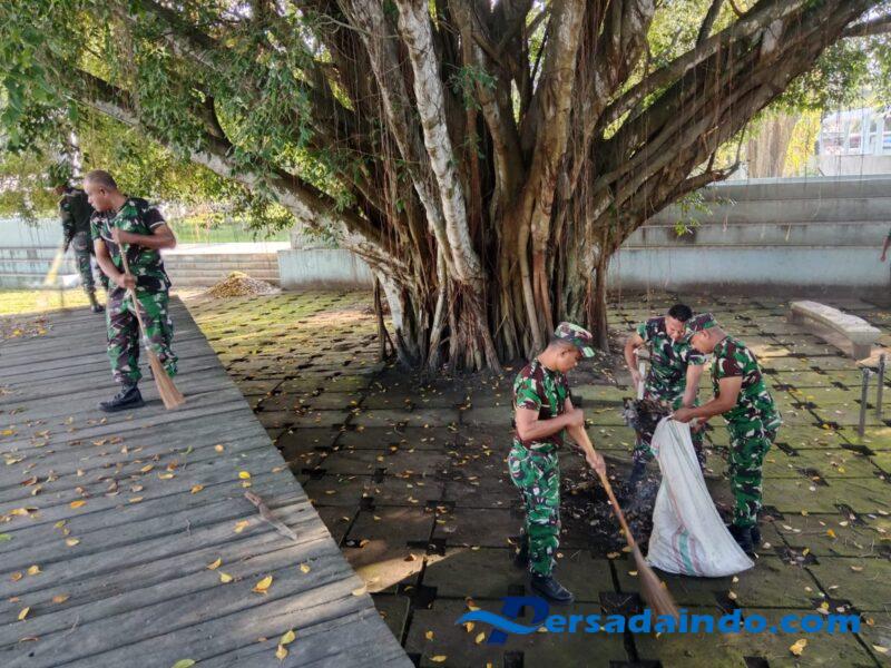 Usai pelaksanaan apel, kegiatan dilanjutkan dengan Jumat Bersih di area Taman Renungan Bung Karno — sebuah tempat bersejarah yang menjadi simbol penting perjuangan kemerdekaan Indonesia. Para anggota Koramil terlihat antusias membersihkan taman dengan melakukan penyapuan, pemotongan rumput, hingga pengumpulan sampah di sekitar area taman.