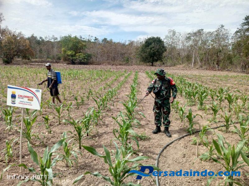KODIM 1605/BELU, Babinsa Umaklaran Koramil 1605-07/Wedomu Serda Hironimus Kono membantu petani dalam melakukan pendampingan penyemprotan hama pada tanaman jagung milik Bapak Yohanes Atok warga Dusun Taekto’o, Desa Umaklaran, Kecamatan Tasifeto Timur, Kabupaten Belu, Selasa (26/8/2025).