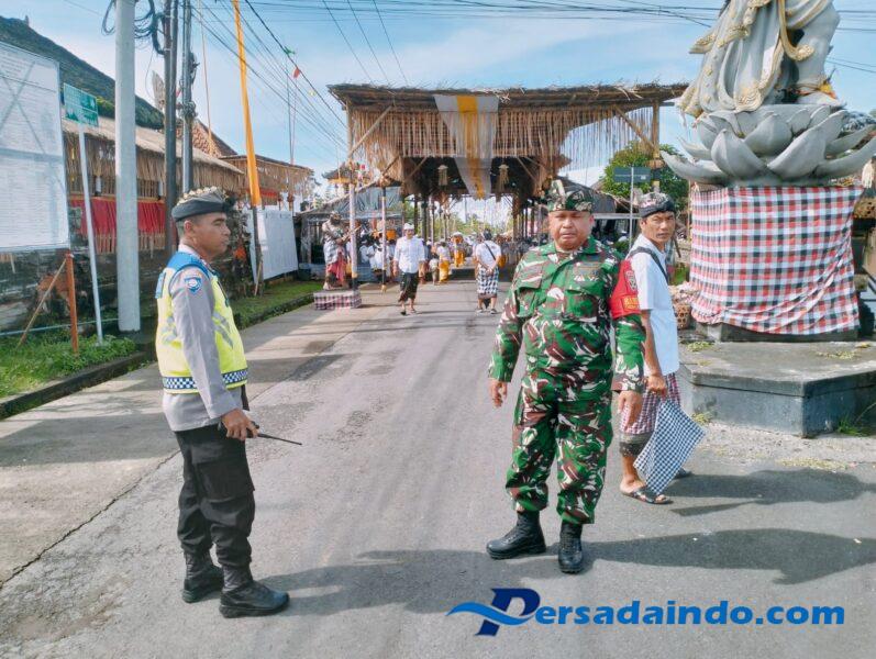Selain pengamanan, Babinsa juga berkoordinasi dengan Bhabinkamtibmas, aparat desa, pecalang, serta unsur keamanan adat lainnya untuk mengatur arus keluar-masuk warga dan memastikan situasi tetap kondusif selama rangkaian upacara berlangsung.