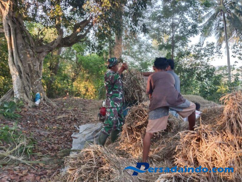 SUMBA BARAT – Babinsa Koramil 02/Walakaka Kodim 1613/Sumba Barat Sertu Alifin membantu warga melaksanakan kegiatan merontok padi di Desa Kabukarudi, Kecamatan Lamboya, Kabupaten Sumba Barat, Minggu (12/10/2025).