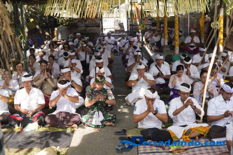 Denpasar, Danrem 163/Wira Satya Ida Idewa Agung Hadisaputra di dampingi Ketua Persit KCK Koorcab Rem 163 PD IX Udayana Ny. Ayu Agung Hadisaputra bersama Prajurit dan PNS Korem 163/Wira Satya mengelar Piodalan Pura Ksatria Raksa Bhuana, diikuti sebanyak 300 orang Umat Hindu bertempat di Jalan PB Sudirman Denpasar pada hari Rabu (5/11/2025).