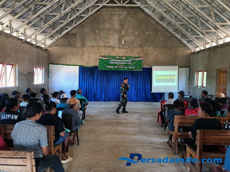 KODIM 1605/BELU, Satgas TNI Manunggal Membangun Desa (TMMD) ke-125 TA 2025 Kodim 1605/Belu memberikan penyuluhan rekrutmen TNI kepada warga masyarakat Desa Naekasa, Kecamatan Tasifeto Barat, Kabupaten Belu, Senin (18/8/2025).