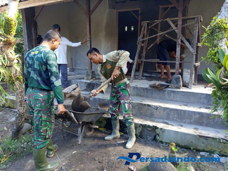 Didampingi Dan SSK Lettu Cpl I Nyoman Prajana anggota Satgas TMMD bekerja bergandengan tangan dengan warga, saling berbagi tugas, mulai dari mengaduk semen, memasang bata, hingga membersihkan lingkungan sekitar.