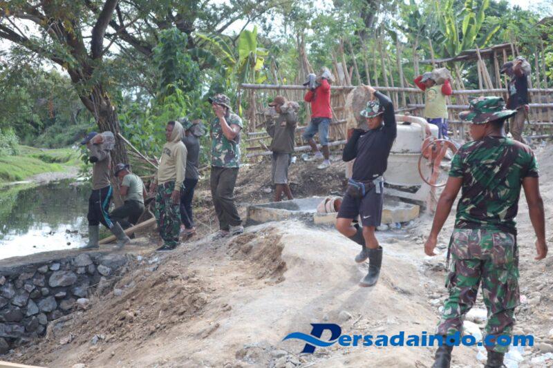 Tanpa kenal lelah, para prajurit bersama warga setempat bahu membahu mengangkut *material batu secara manual* untuk pembangunan *jembatan penghubung menuju area persawahan masyarakat*. Jembatan tersebut merupakan salah satu sasaran fisik utama dalam program TMMD kali ini, yang diharapkan dapat meningkatkan akses dan mobilitas warga, khususnya petani dalam mengangkut hasil panen.