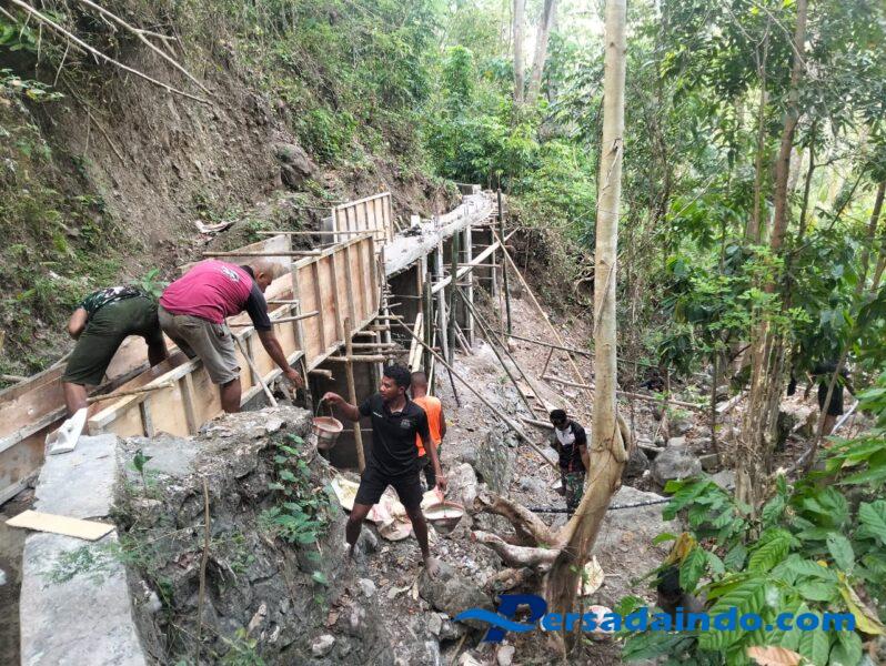 Kegiatan yang dilakukan meliputi pengecoran dinding jalur irigasi serta pengangkutan material pasir ke lokasi proyek. Pekerjaan ini menjadi bagian dari sasaran fisik TMMD untuk membuka akses air yang lebih optimal bagi lahan pertanian warga.
