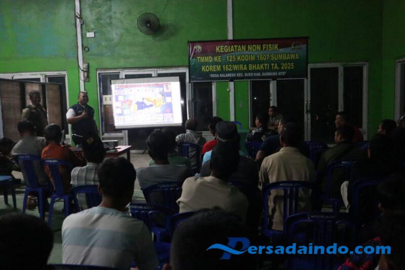 Sumbawa – NTB, 7 Agustus 2025 – Dalam rangka meningkatkan kesadaran dan kesiapsiagaan masyarakat terhadap potensi bencana alam, Satuan Tugas TNI Manunggal Membangun Desa (TMMD) ke-125 Kodim 1607/Sumbawa menggelar kegiatan penyuluhan tentang penanggulangan bencana alam di Aula Desa Kalabeso, Kecamatan Buer, Kabupaten Sumbawa, Kamis (7/8/2025).