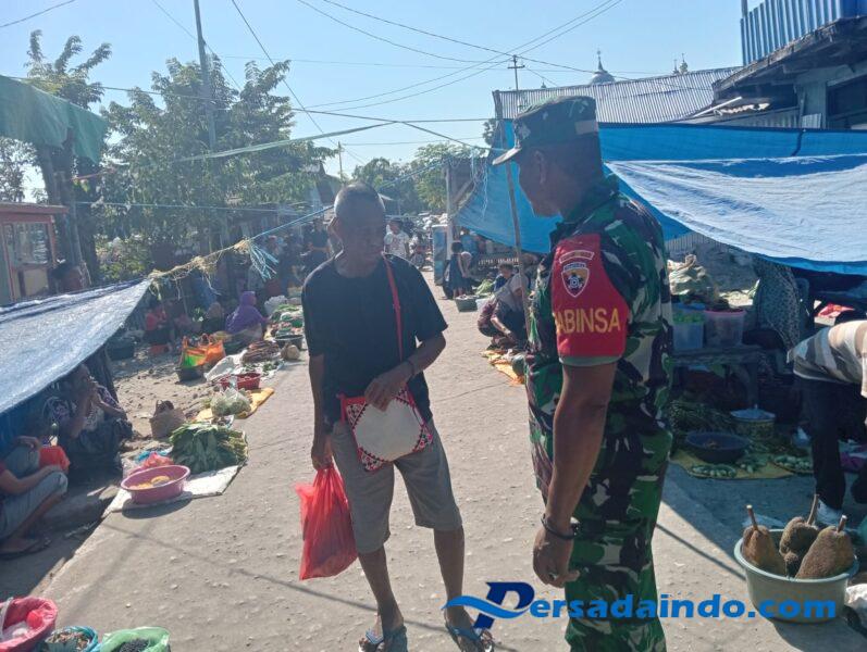 Dalam kegiatan tersebut, Sertu Donatus Kiri dari Babinsa Koramil 1602-04/Maurole hadir langsung berinteraksi dengan masyarakat setempat dan pengunjung pasar. Kegiatan yang dilaksanakan bertujuan untuk mengajak masyarakat menjaga keamanan, ketertiban, dan kebersihan pasar agar tetap kondusif.