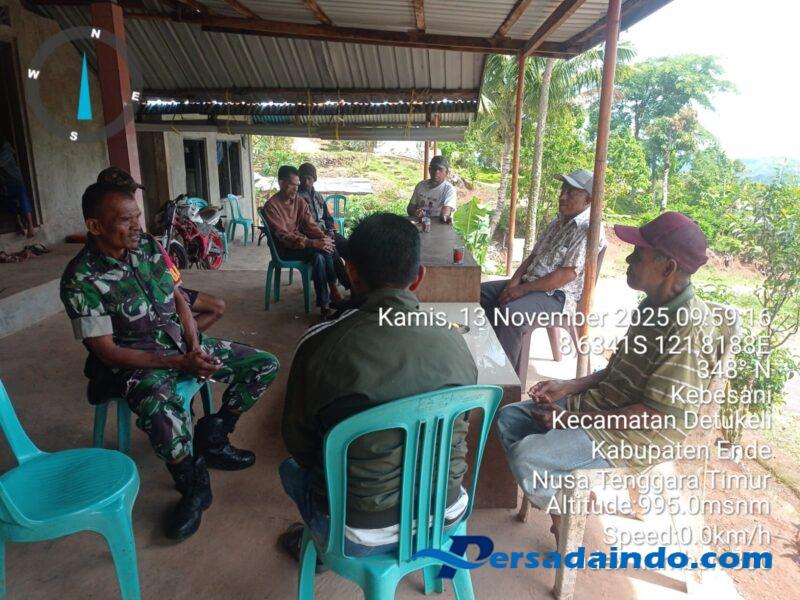 Ende, – Babinsa Koramil 1602-04/Maurole, Pelda Yonatan Duil, melaksanakan kegiatan Komunikasi Sosial (Komsos) dan Pengamanan Wilayah (Pamwil) di Desa Kebesani, Kecamatan Detukeli, Kabupaten Ende, Kamis (13/11/2025). Kegiatan ini dilakukan untuk memantau keamanan wilayah serta mempererat hubungan TNI AD dengan masyarakat setempat.