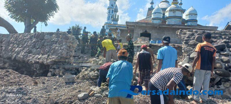 NTT — ALOR —, Anggota TNI dari Koramil 1622-01/Kalabahi bersama masyarakat melaksanakan karya bakti renovasi penembokan abrasi pantai di Masjid Nurul Islamiyah Weileing, Kelurahan Adang, Kecamatan Alor Barat Laut, Sabtu (27/09/2025). Kegiatan ini dipimpin langsung oleh Danposramil Abal, Serka Suandi Mohala, dengan melibatkan sejumlah personel Babinsa serta tokoh agama dan masyarakat.