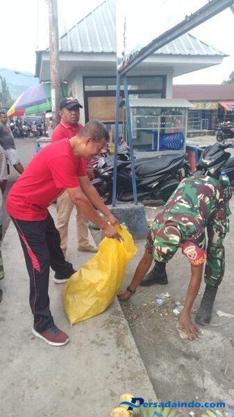Antusiasme warga terlihat jelas selama kegiatan berlangsung. Masyarakat bersama aparat dan pemuda setempat bergotong royong membersihkan pasar, saluran air, serta area sekitar yang menjadi pusat aktivitas ekonomi masyarakat.