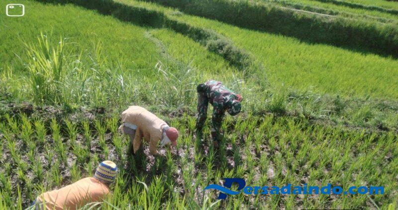 Tak hanya sekadar datang mengecek kondisi lahan, Kopda Sapriadi benar-benar turun ke sawah, bergabung dengan para petani membersihkan rumput liar dan menghalau hama yang menyerang tanaman padi. Kehadirannya membawa semangat baru bagi para petani yang sedang berjuang mengelola lahan di tengah tantangan musim.
