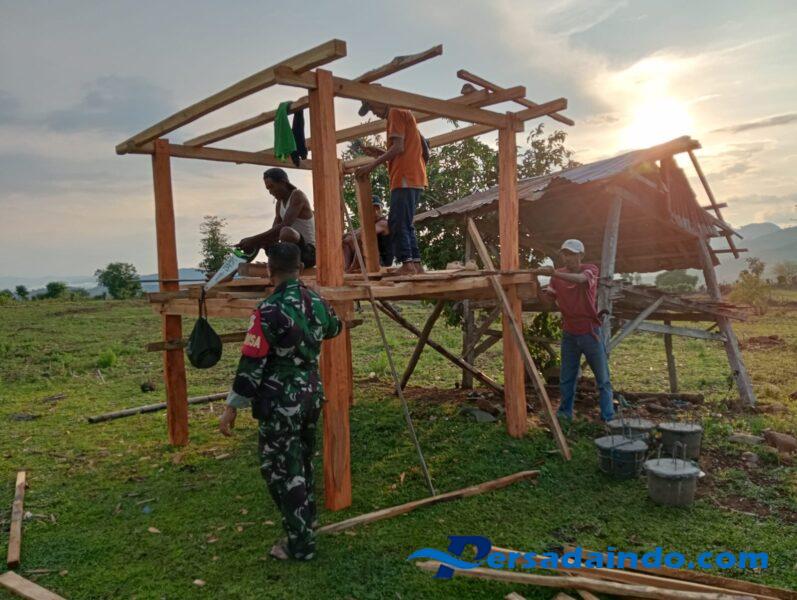 Babinsa Desa Daha Koramil 1614-03/Hu’u, Sertu Abdullah Maulana, melaksanakan kegiatan karya bakti membantu warga binaan membangun pondok di So Lancoha, Desa Daha, Kecamatan Hu’u, Kabupaten Dompu.