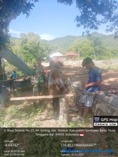 Sumbawa Barat, NTB — Proses pembangunan Kodim Daerah Komando Masyarakat (KDKMP) di Desa Air Suning, Kecamatan Seteluk, terus mendapat pengawalan ketat dari aparat teritorial. Pada Selasa, 2 Desember 2025 pukul 08.30 WITA, Babinsa Desa Air Suning, Sertu Ruslin, melaksanakan pemantauan langsung terhadap tahapan pekerjaan perakitan besi cakar ayam yang menjadi bagian penting dari pondasi bangunan KDKMP.