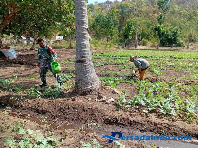 NTT— Alor —, Dalam rangka mendukung ketahanan pangan masyarakat, Babinsa Desa Tanglapui Timur, Serka Tobias Madde, melaksanakan kegiatan bakti membantu warga di wilayah binaannya. Pada Jumat, 19 September 2025 pukul 09.00 Wita, Babinsa turun langsung ke lahan bedengan milik Ibu Maria di Desa Air Mancur, Kecamatan Alor Timur Laut, untuk membantu menyiram tanaman sayur dan semangka yang sudah tumbuh besar.