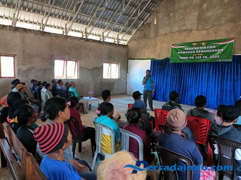 KODIM 1605/BELU, Satgas TMMD ke 125 Kodim 1605/Belu gandeng Badan Kesatuan Kebangsaan dan Politik (Kesbangpol) Kabupaten Belu memberikan penyuluhan wawasan kebangsaan kepada masyarakat Desa Naekasa, Kecamatan Tasifeto Barat, Kabupaten Belu, Selasa (19/8/2025).