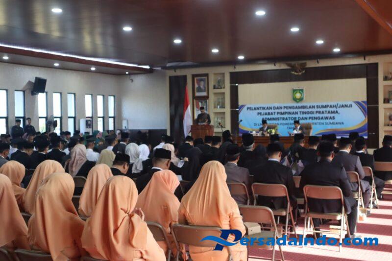 Acara tersebut dipimpin langsung oleh *Bupati Sumbawa Bapak H. Syarafudin Jarot, M.P*, dengan dihadiri oleh unsur Forkopimda, para kepala OPD, serta keluarga dan kerabat para pejabat yang dilantik. Sebanyak puluhan pejabat resmi dilantik dan diambil sumpahnya untuk menempati posisi strategis dalam pemerintahan daerah, guna memperkuat roda birokrasi dan pelayanan publik.