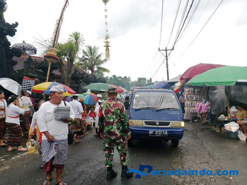 Babinsa bersama Pecalang Banjar adat setempat mengamankan dan mengatur lalu lintas demi lancarnya kegiatan upacara Dewa Yadnya tersebut