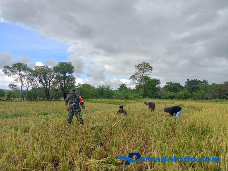 NTT.Sumba Timur – Wujud nyata kepedulian terhadap ketahanan pangan dan kesejahteraan masyarakat, Babinsa Koramil 06/Karera Kodim 1601/Sumba Timur, Sertu Ferdinan, turun langsung ke sawah membantu petani memanen padi di Desa Nggongi, Kecamatan Karera, Kabupaten Sumba Timur, Rabu (02/07/2025).