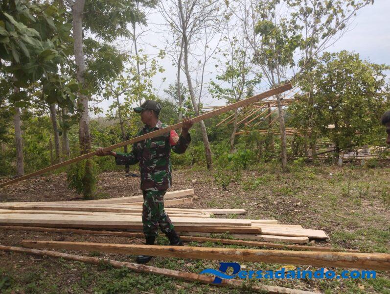SUMBA BARAT – Dalam rangka menjalin hubungan yang harmonis dengan warga binaan, Babinsa Koramil 02/Walakaka Kodim 1613/Sumba Barat, Sertu Alifin, melaksanakan kegiatan gotong royong membantu warga yang sedang membangun rumah di Desa Kabukarudi, Kecamatan Lamboya, Kabupaten Sumba Barat, Jumat (27/6/2025).