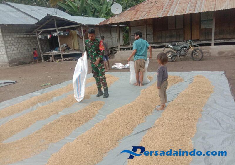 NTT – Sumba Timur. Sebagai bentuk kepedulian terhadap warga binaan, Babinsa Koramil 03/Pahunga Lodu jajaran Kodim 1601/Sumba Timur, Pratu Anton Ndima, membantu warga menjemur padi milik Bapak Alfon,di Desa Palanggai Kecamatan Pahunga Lodu Kabupaten Sumba Timur, Minggu (07/09/2025)