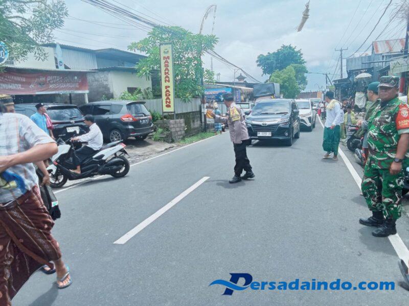 Sebagai bentuk dukungan terhadap kelancaran ibadah dan menjaga kenyamanan masyarakat, Babinsa bersama Bhabinkamtibmas dan Banser mengatur arus lalu lintas di jalur Gentong–Tegallalang yang rawan padat, sekaligus membantu penyeberangan jemaah yang datang.