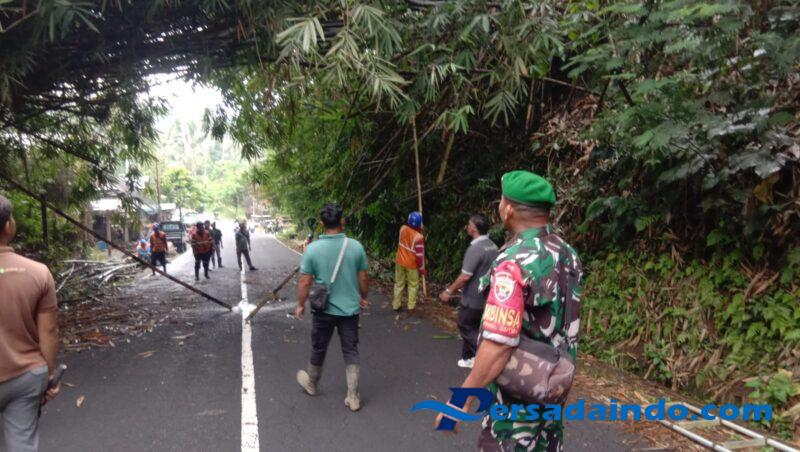 Bangli – Babinsa Desa Undisan Koramil 03/Tembuku Kodim 1626/Bangli Sertu I Nyoman Suganda membantu penebangan pohon bambu yang mengganggu perjalanan lalulintas di jalan Raya Undisan jalur menuju besakih di banjar lokasari Desa Undisan, Kecamatan Tembuku, Kabupaten Bangli. pada senin (02/06/25)