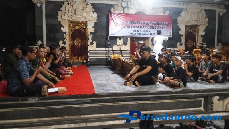 Gianyar – Siangan, Jumat (24/10/2025) Sebagai bentuk dukungan terhadap pelestarian seni dan budaya di wilayah binaannya, Babinsa Desa Siangan Koramil 1616-01/Gianyar Serka I Komang Kartawan bersama Bhabinkamtibmas Desa Siangan Aiptu I Ketut Sudiksa menghadiri kegiatan pembukaan pelatihan Sekaa Gong Anak-anak Desa Siangan yang berlangsung di Balai Banjar Lokaserana, Desa Siangan, Kecamatan Gianyar.