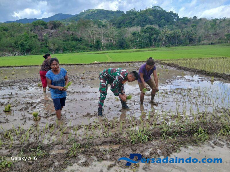 NTT-Sumba Timur .Wujud nyata dukungan terhadap program ketahanan pangan, Babinsa Koramil 04/Tabundung Kodim 1601/Sumba Timur, Pratu Denis Nderu Peta, mendampingi para petani dalam kegiatan membajak sawah sekaligus menanam padi di Desa Praingkareha, Kecamatan Tabundung, Kabupaten Sumba Timur, Senin (13/10/2025).