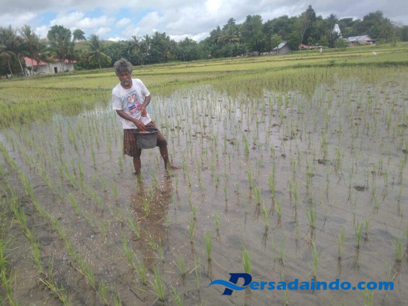 NTT-Sumba Timur.Sebagai bentuk nyata kepedulian terhadap ketahanan pangan di wilayah binaannya, Babinsa Koramil 05/Waingapu Kodim 1601/Sumba Timur, Koptu Mukmin Matoke, turun langsung ke sawah mendampingi para petani dalam kegiatan penyebaran pupuk untuk tanaman padi di Kelurahan Mauliru, Kecamatan Kambera, Kabupaten Sumba Timur, Rabu (14/08/2025).