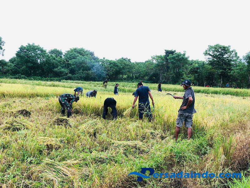 NTT- Sumba Timur,Babinsa Koramil 06/Karera, Kodim 1601/Sumba Timur, Pratu Hezron Wora mendampingi warga binaan memanen padi di Desa Nggongi, Kecamatan Karera, Kabupaten Sumba Timur, Kamis (29/05/2025)