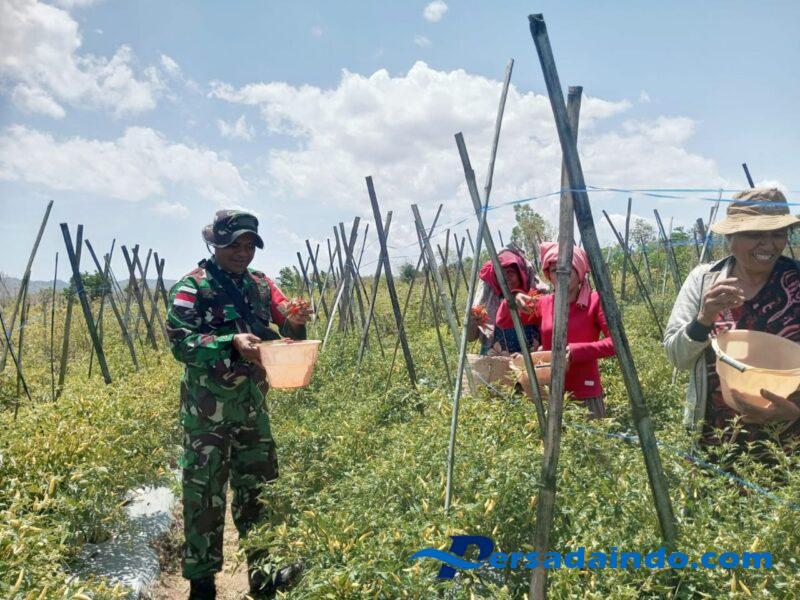 KODIM 1605/BELU, Babinsa Desa Umaklaran Koramil 1605-07/Wedomu Serda Hironimus Kono membantu petani dalam pelaksanaan proses memanen cabai di lahan petani milik Bapak