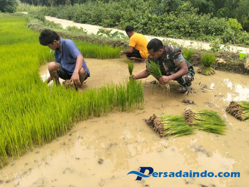 Dalam kesempatan tersebut, Sertu Samuel Lede Kalli turut membantu warga mencabut bibit padi yang akan dipindahkan ke lahan tanam.