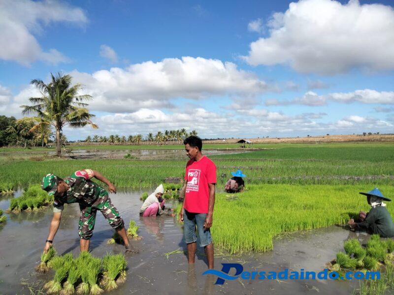 Guna percepatan masa tanam, Babinsa bersama masyarakat setempat membantu menanaman padi di komplek persawahan Lela Desa Lida Besi Kecamatan Rote Tengah Kabupaten Rote Ndao.