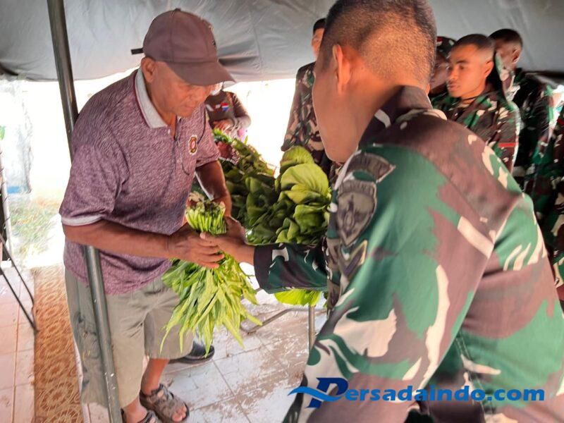Menariknya, dalam kegiatan tersebut Kompi Pertanian Yonif TP 834/WM turut membagikan sayur hasil panen sendiri sebagai bentuk dukungan terhadap pemenuhan gizi masyarakat.